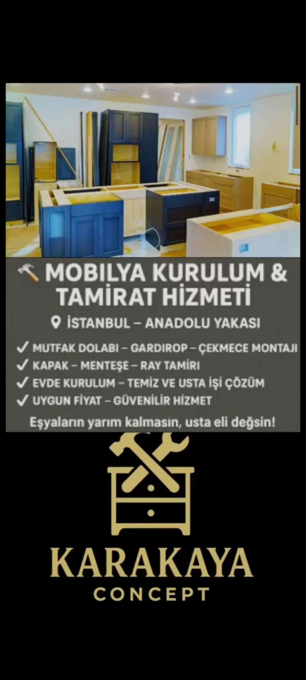 Mobilya montaj, kurulum, tamir, değişim ve sökme işleri alanında tecrübeli bir ustayım. Mutfak dolabı, gardırop, yatak, baza, kapı, menteşe ve benzeri ev içi mobilya ve donanımların kurulum ve onarımlarını titizlikle yaparım.